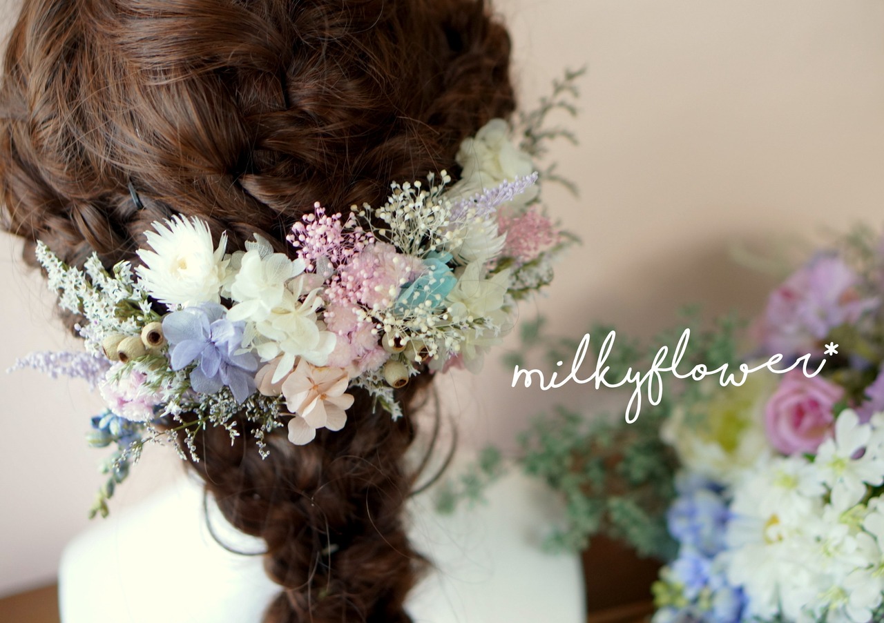 ナチュラルなピンク、パープル、水色、ブルー、ホワイトをミックスしたヘッドアクセサリー♡