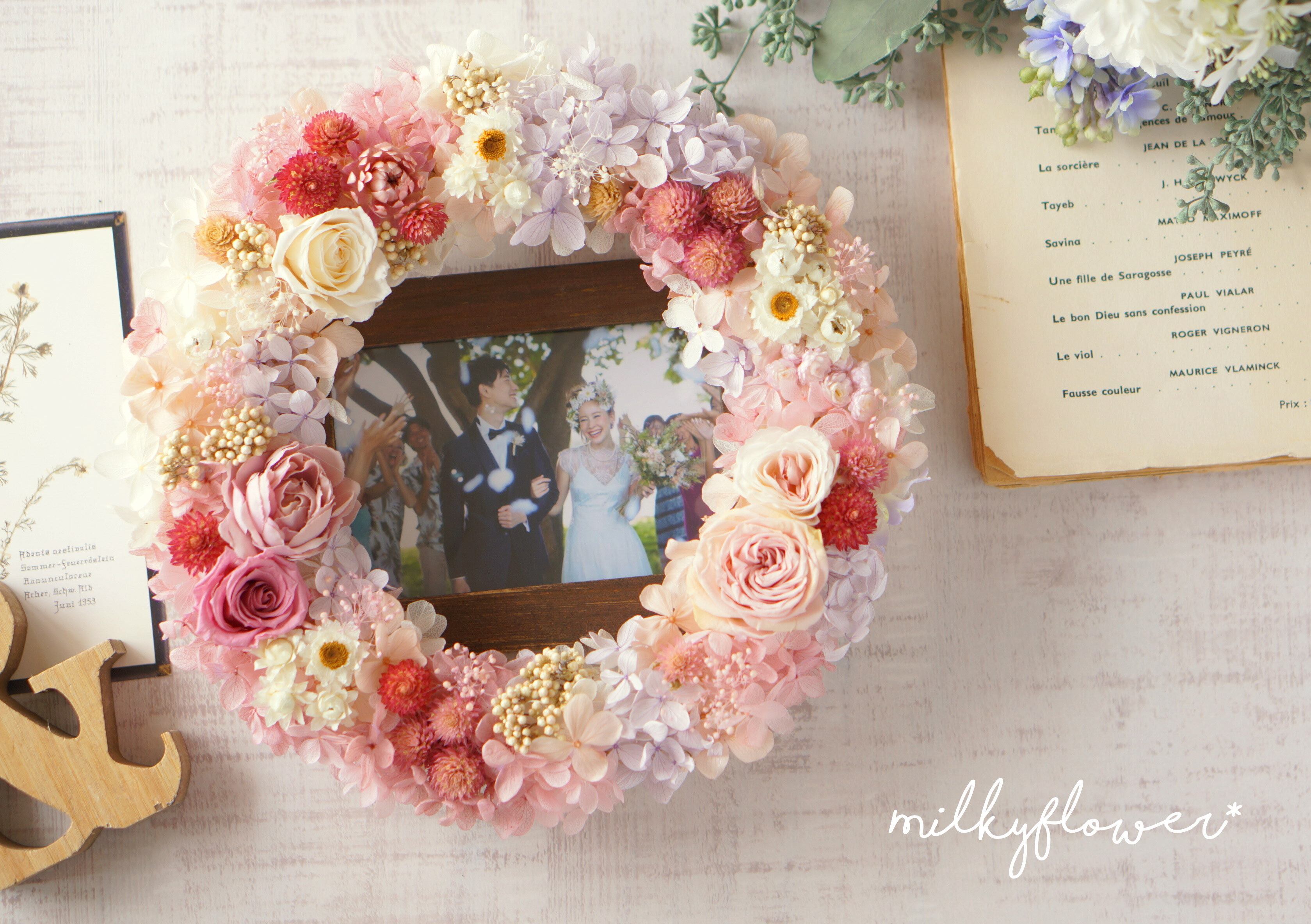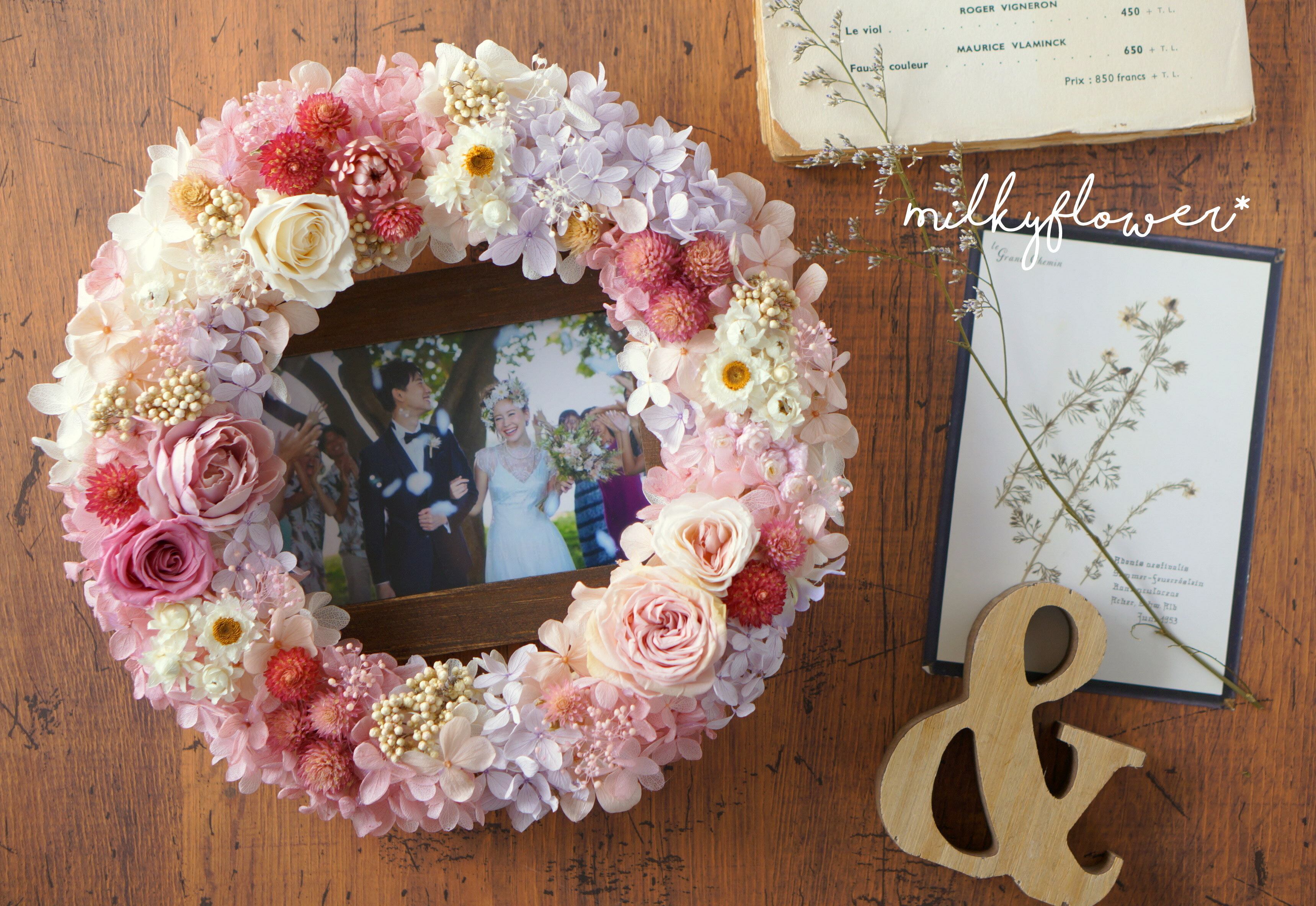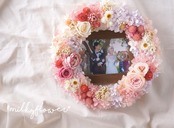 中央にはフォトフレームをお付けしていますので、前撮りのお写真や思い出のお写真を入れて、写真とともにリースを飾って頂けます*