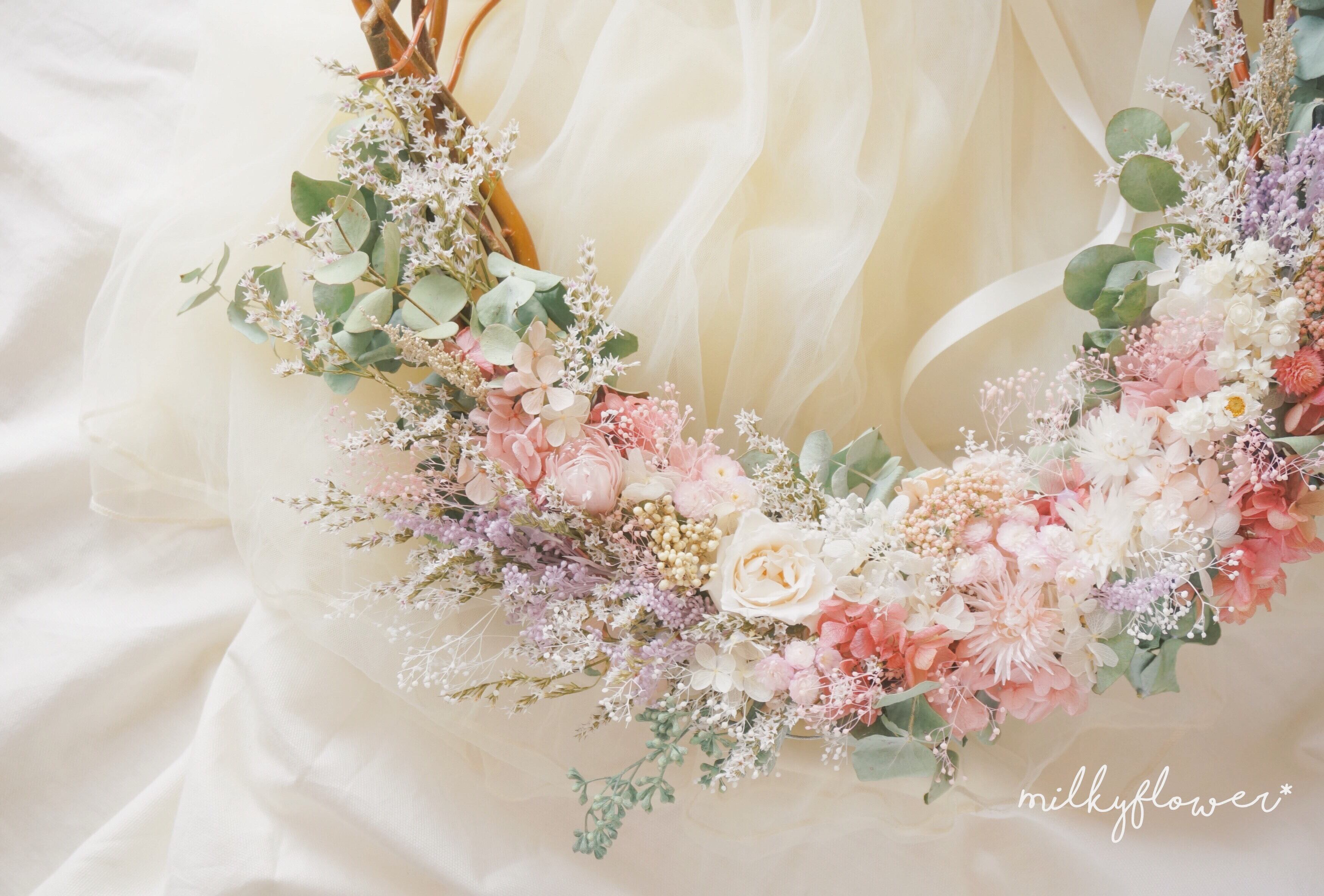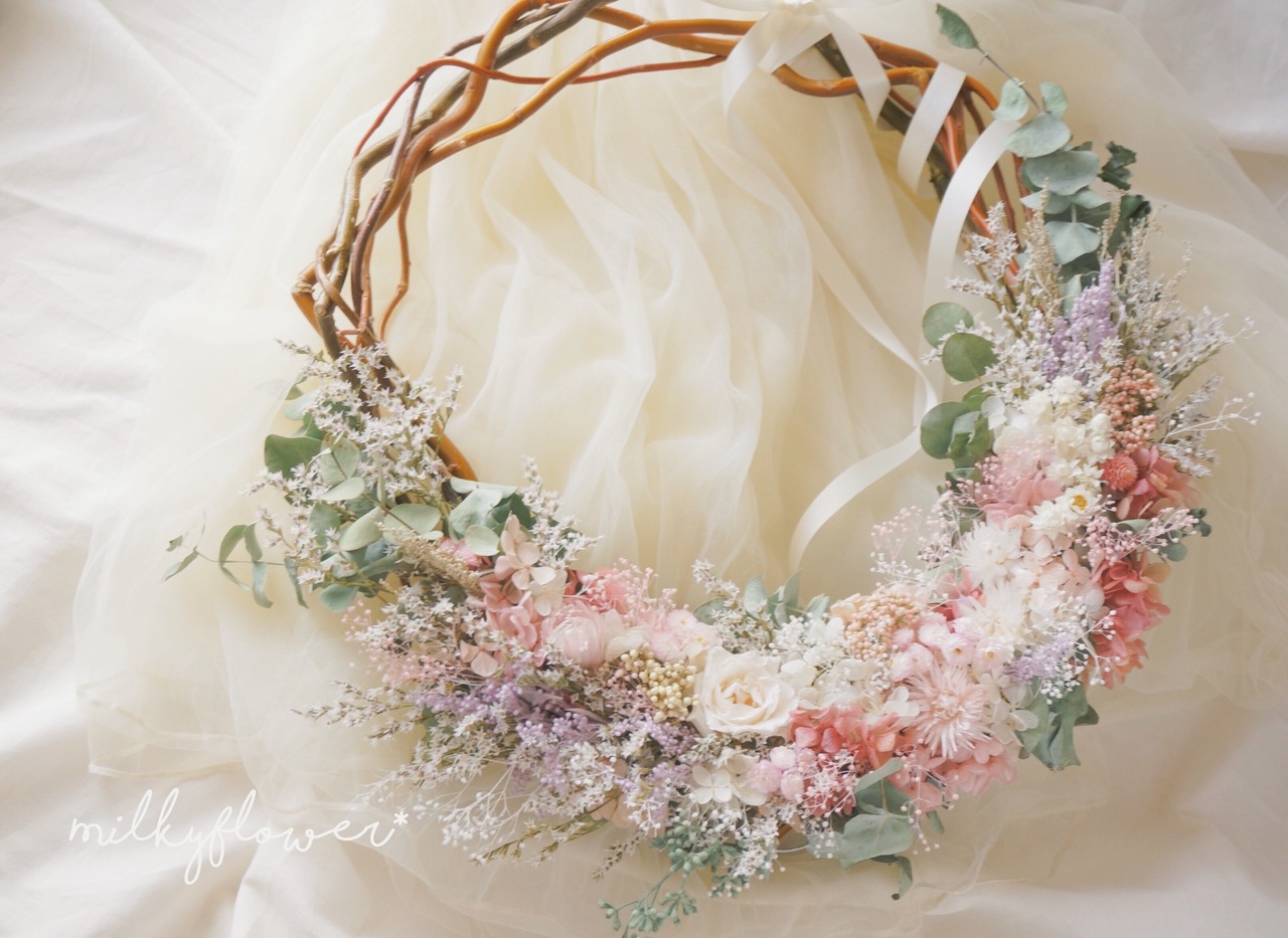 やわらかいMilkyなホワイト・ピンク・ラベンダー、カシスをミックスした乙女色のナチュラルリースです♡